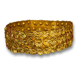 Nimrud era um ancestral cidade da Assíria, localizada no Vale do Tigre, no norte do Iraque. Na década de 1980, foi feita uma incrível descoberta arqueológica, comparável à da tumba do rei Tutancâmon na década de 1930. Este foi o túmulo real de Nimrud. No entanto, poucas pessoas ouviram falar do tesouro de Nimrud como o do rei Tut. Isto é provavelmente porque O tesouro do rei Tut percorreu o mundo desde sua descoberta na década de 1930, enquanto o tesouro de ouro de Nimrud só foi descoberto recentemente e exibido ao público iraquiano por um período muito curto antes do início da guerra no Kuwait. A Assíria foi um dos maiores impérios do Antigo Oriente Próximo por volta do século XIV aC. Escavações arqueológicas de outras tumbas em meados de 1900 revelaram ornamentos e decorações, mas as tumbas das rainhas assírias com sua enorme quantidade de ouro não foram descobertas até cerca de 1989. Acredita-se que os artefatos de ouro tenham cerca de 2.700 anos de idade.  | | Pulseira com incrustações de ouro e pedras preciosas |